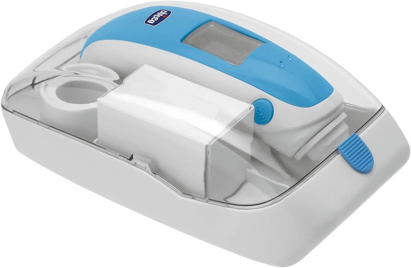 Chicco thermometer with beep completion, temperature alert over 37.5°C, and automatic switch-off. Includes a holder for secure storage and easy probe cover installation.