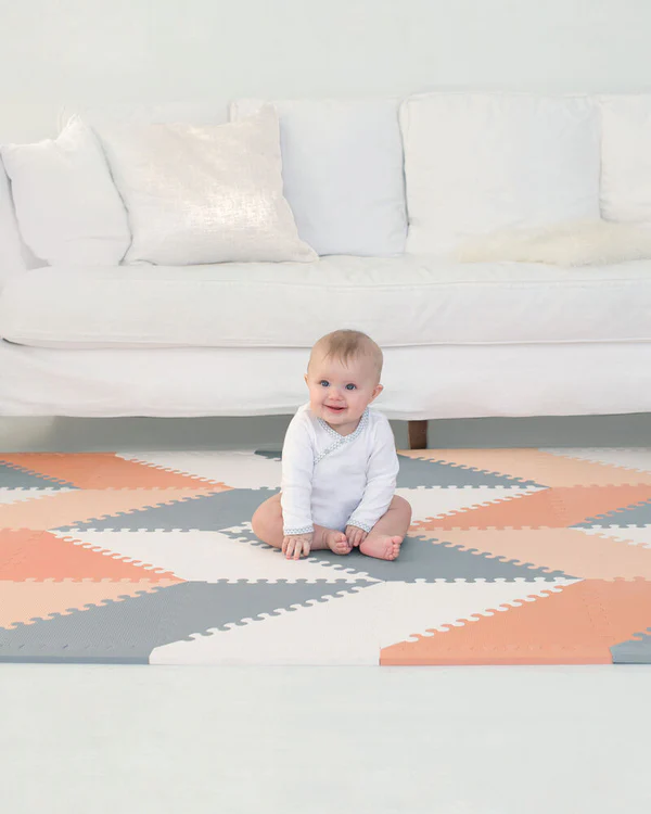 Stylish, safe, and customizable—our décor-friendly foam floor tiles let you create a play space that fits right into your home. Designed with baby’s comfort and your style in mind, the modern triangle-shaped tiles connect easily like a puzzle, allowing you to create endless pattern combinations for a unique, personalized look.