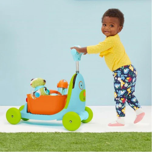 Designed to grow with your little one through three stages of fun, Skip Hop’s colorful Ride-On Toy helps develop motor skills, balance, and coordination during playtime. In stage one, early walkers can push and pull the wagon—also a handy spot for favorite toys. Stage two transforms the storage tub into a seat for ride-on mode. At stage three, simply remove the seat, raise the adjustable handle, hop on the scooter, and take a spin! Kids will love pressing the front button to enjoy headlights, melodies, beeps, and other fun sound effects as they zoom around.